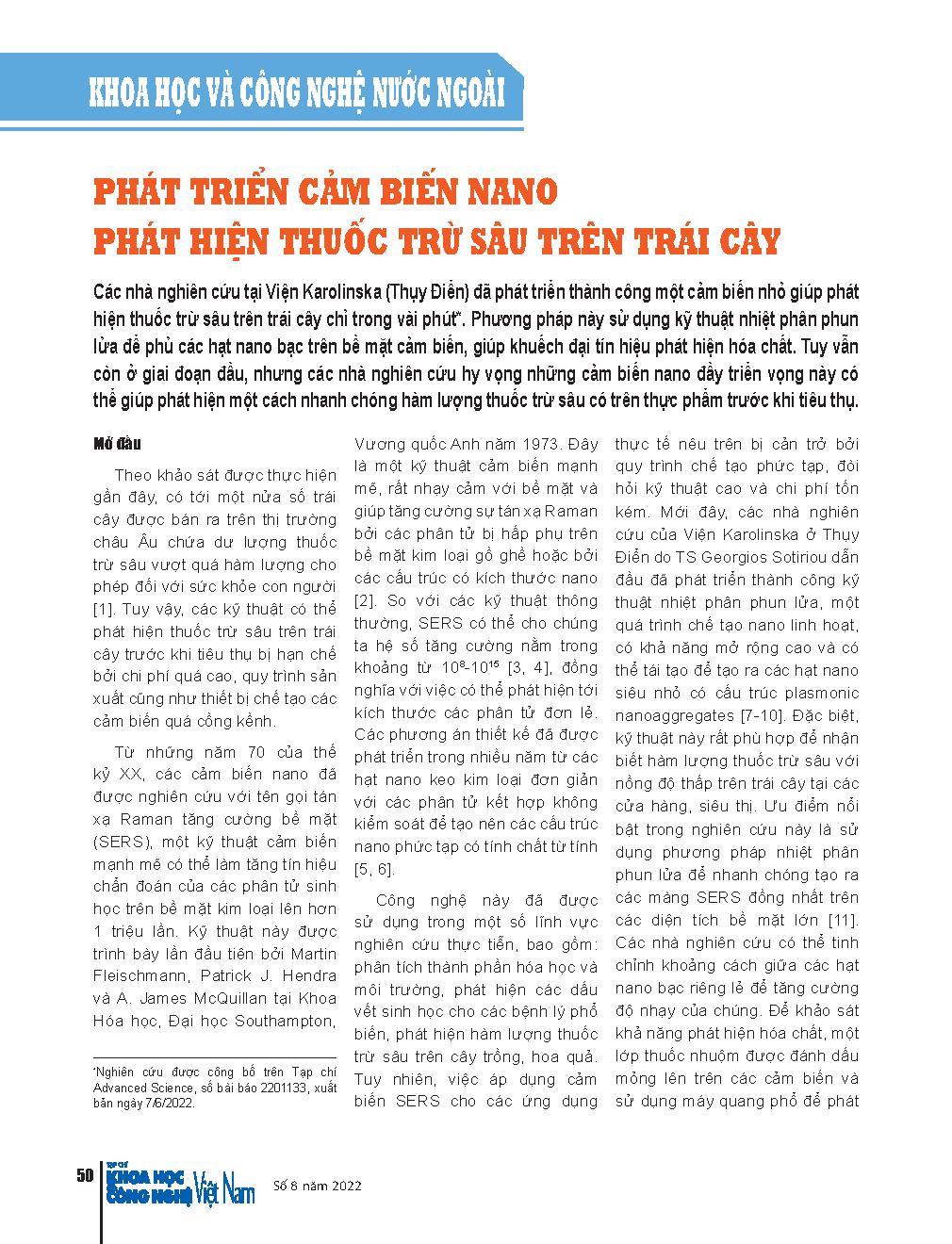 Phát triển cảm biến nano phát hiện thuốc trừ sâu trên trái cây = Development of nanosensors to detect pesticides on fruits