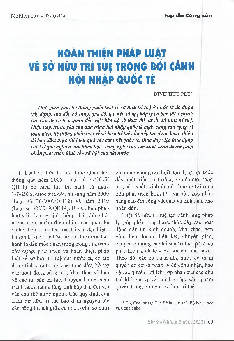 Hoàn thiện pháp luật về sở hữu trí tuệ trong bối cảnh hội nhập quốc tế = Perfecting the law on intellectual property in the context of international integration