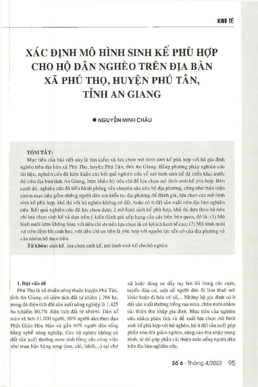 Xác định mô hình sinh kế phù hợp cho hộ dân nghèo trên địa bàn xã Phú Thọ, huyện Phú Tân, tỉnh An Giang = Selecting appropriate livelihood models for the poor households in Phu Tho commune, Phu Tan district, An Giang province