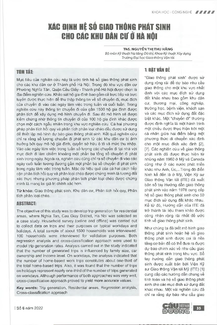 Xác định hệ số giao thông phát sinh cho các khu dân cư ở Hà Nội = Trip generation rates for residential areas in Hanoi