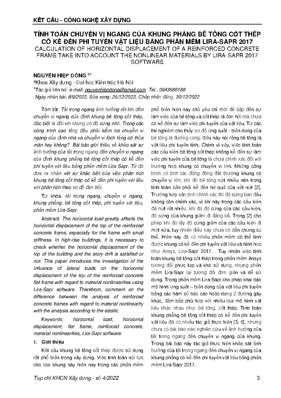 Tính toán chuyển vị ngang của khung phẳng bê tông cốt thép có kể đến phi tuyến vật liệu bằng phần mềm lira-sapr 2017 = Calculation of horizontal displacement of a reinforced concrete frame take into account the nonlinear materials by lira-sapr 2017 softwa