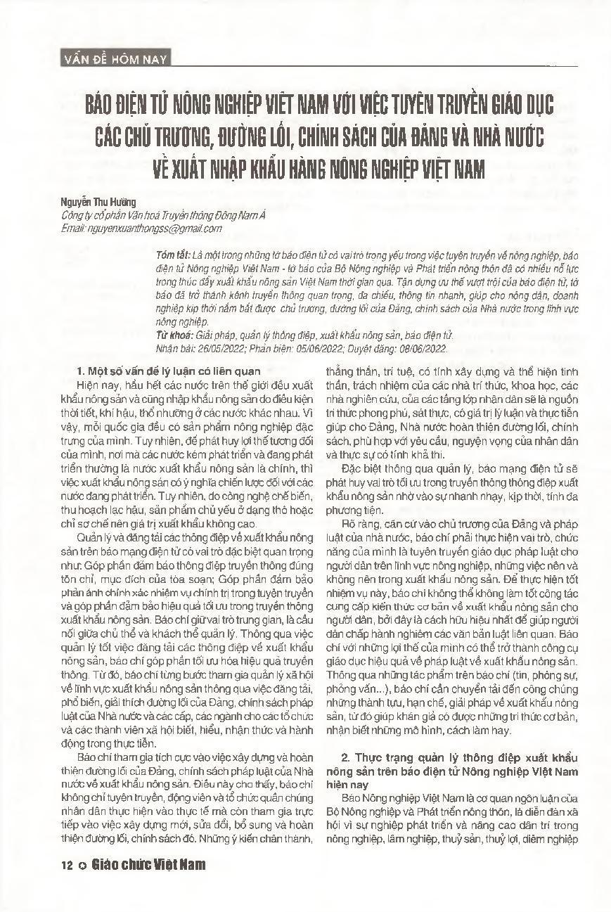 Báo điện tử Nông nghiệp Việt Nam với việc tuyên truyền giáo các chủ trương, đường lối, chính sách của Đảng và Nhà nước về xuất khẩu hàng nông nghiệp Việt Nam