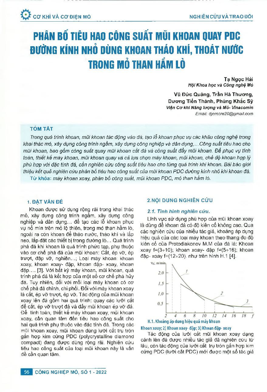 Phân bố tiêu hao công suất mũi khoan quay pdc đường kính nhỏ dùng khoan tháo khí, thoát nước trong mỏ than hầm lò = Power cosumption distribution of polycrystalline diamond compact bit of small diameter for drilling boreholes for gas and water draining in