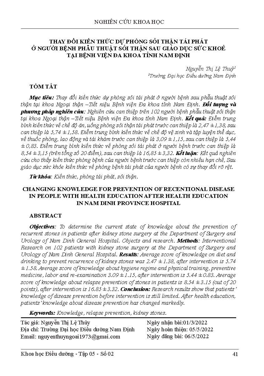 Thay đổi kiến thức dự phòng sỏi thận tái phát ở người bệnh phẫu thuật sỏi thận sau giáo dục sức khỏe tại Bệnh viện Đa khoa tỉnh Nam Định = Changing knowledge for prevention of recentional disease in people with health education after health education in n