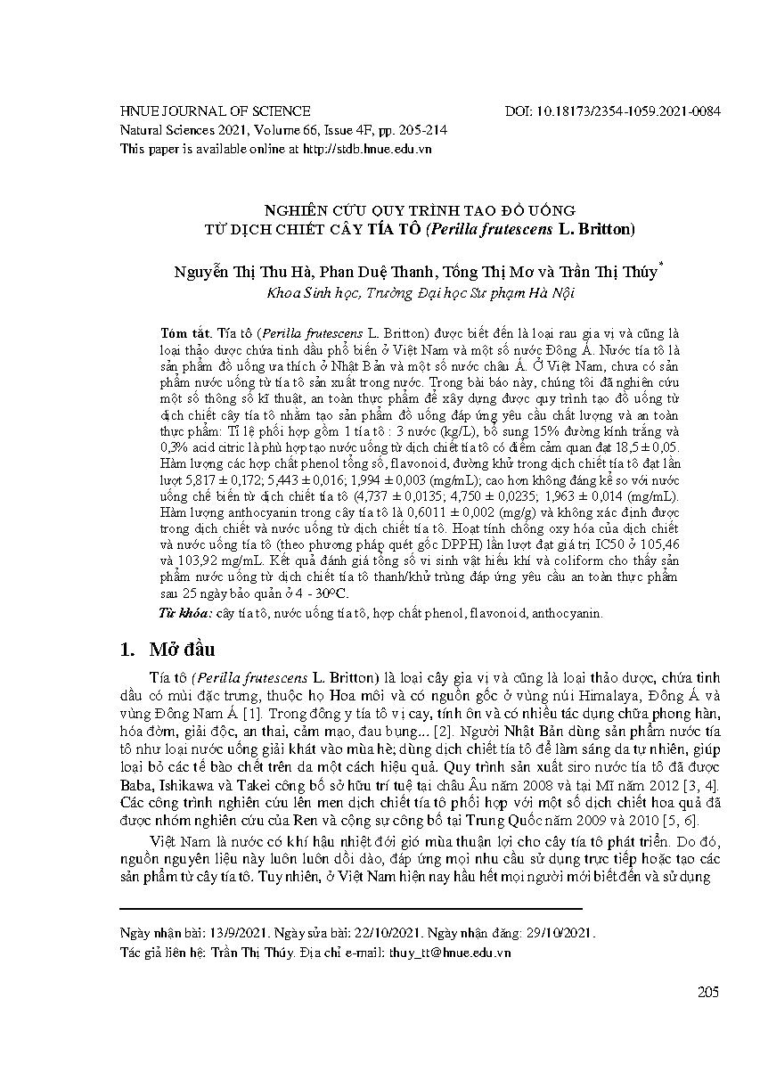 Nghiên cứu quy trình tạo đồ uống từ dịch chiết cây tía tô (Perilla frutescens L. Britton) = Study on the process of preparing perilla drinks from Perilla frustescens (L.) Britton