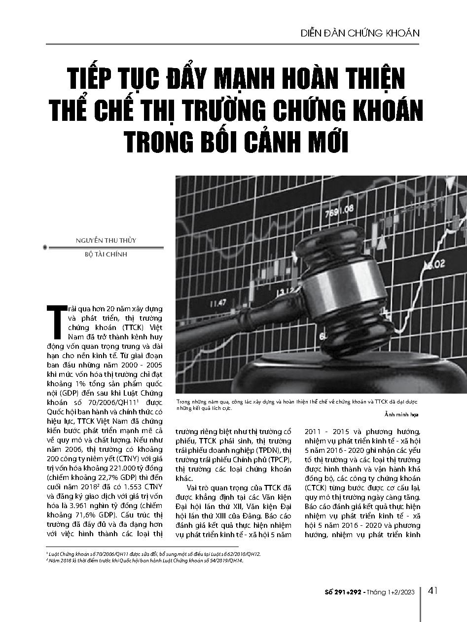 Tiếp tục đẩy mạnh hoàn thiện thể chế thị trường chứng khoán trong bối cảnh mới = Continously impovement of stock market regulation in the new context