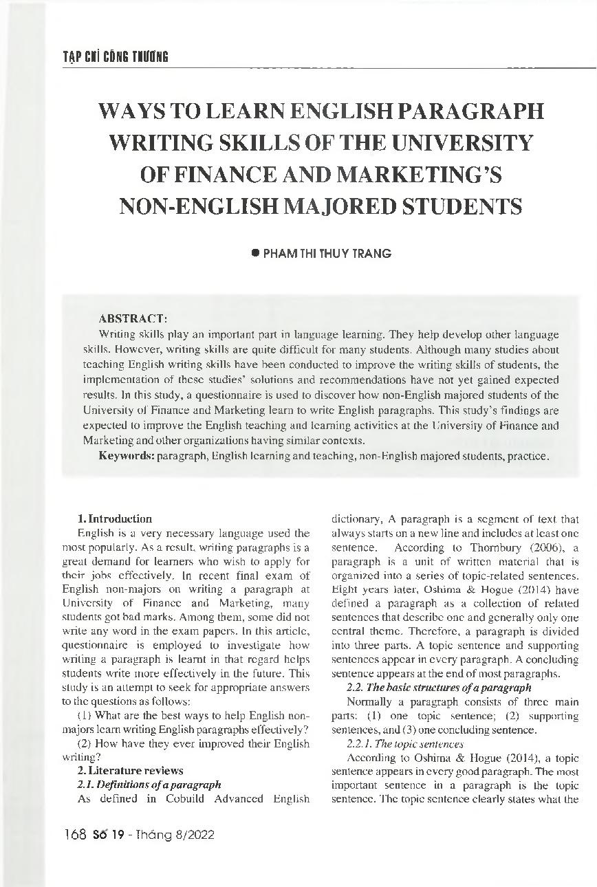 Cách học kỹ năng viết đoạn văn bằng tiếng Anh của sinh viên không thuộc chuyên ngành tiếng Anh tại Trường Đại học Tài chính - Marketing = Ways to learn English paragraph writing skills of the University of Finance and Marketing&; 39;s non-English majored s