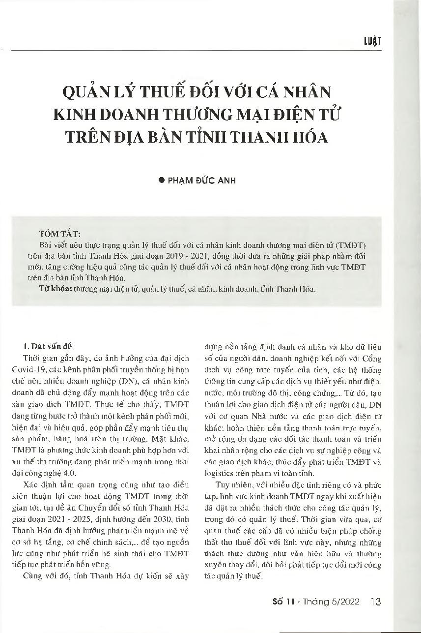 Quản lý thuế đối với cá nhân kinh doanh thương mại điện tử trên địa bàn tỉnh Thanh Hóa = Tax management of individuals who do e-commerce businesses in Thanh Hoa province