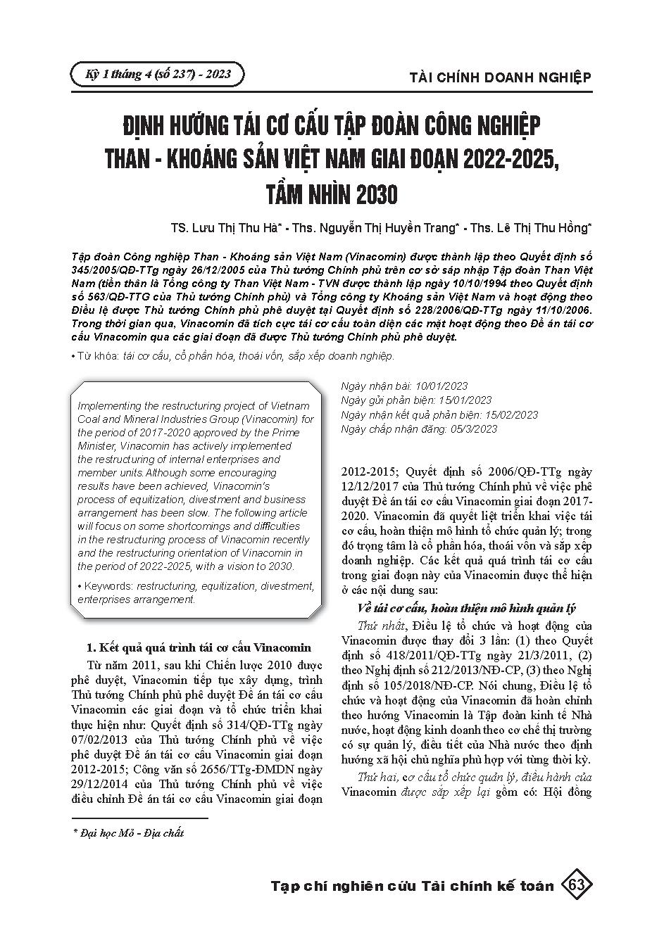 Định hướng tái cơ cấu Tập đoàn Công nghiệp Than - Khoáng sản Việt Nam giai đoạn 2022-2025, tầm nhìn 2030 = Orientations on restructions of Vietnam coal - mineral industrial corporation in the period of 2022-2025, vision 2030