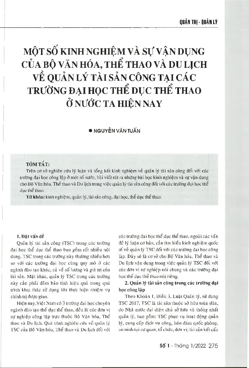 Một số kinh nghiệm và sự vận dụng của Bộ Văn hóa, Thể thao và Du lịch về quản lý tài sản công tại các trường đại học thế dục thể thao ở nước ta hiện nay = Some lessons learnt for the Ministry of Culture, Sports and Tourism of Vietnam in public property ma