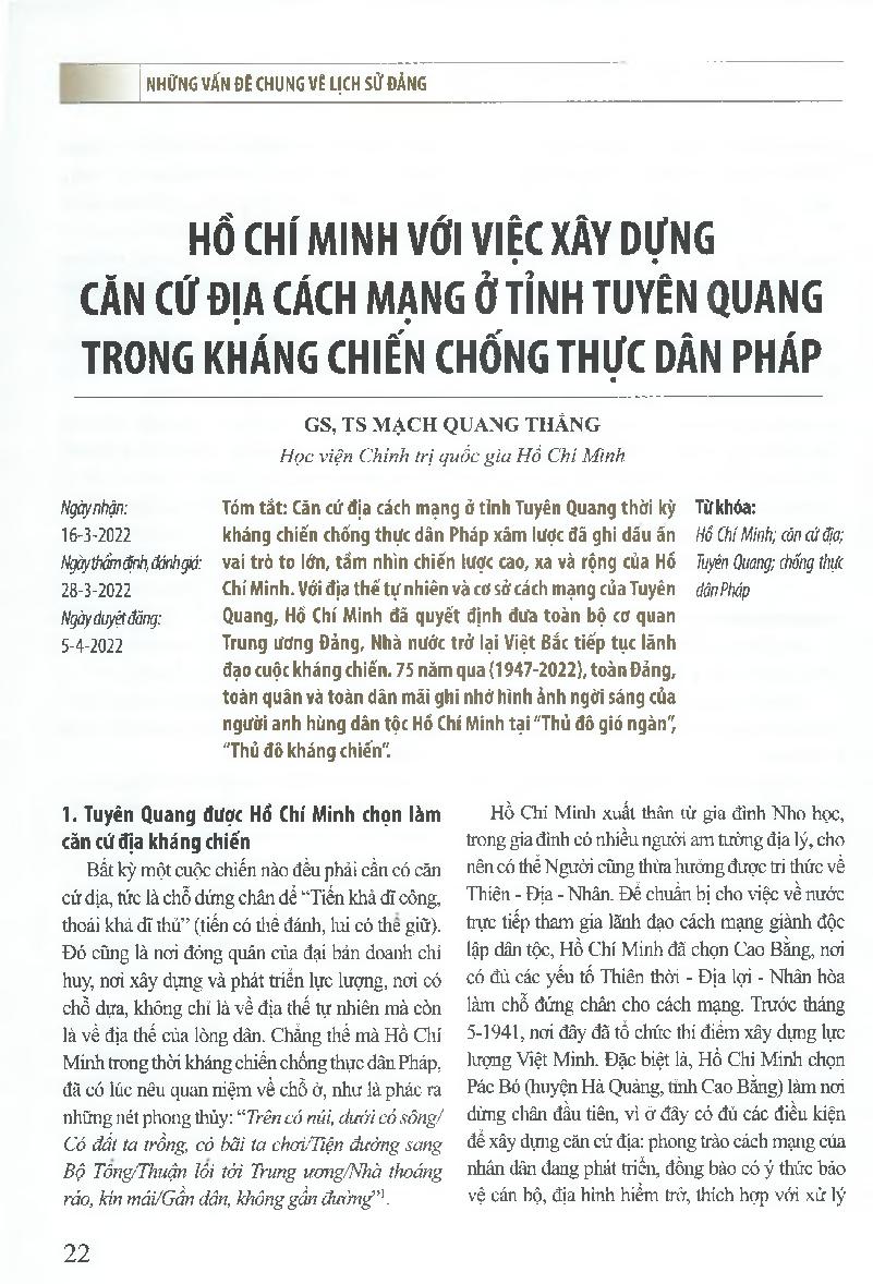 Hồ Chí Minh với việc xây dựng căn cứ địa cách mạng ở tỉnh Tuyên Quang trong kháng chiến chống thực dân Pháp
