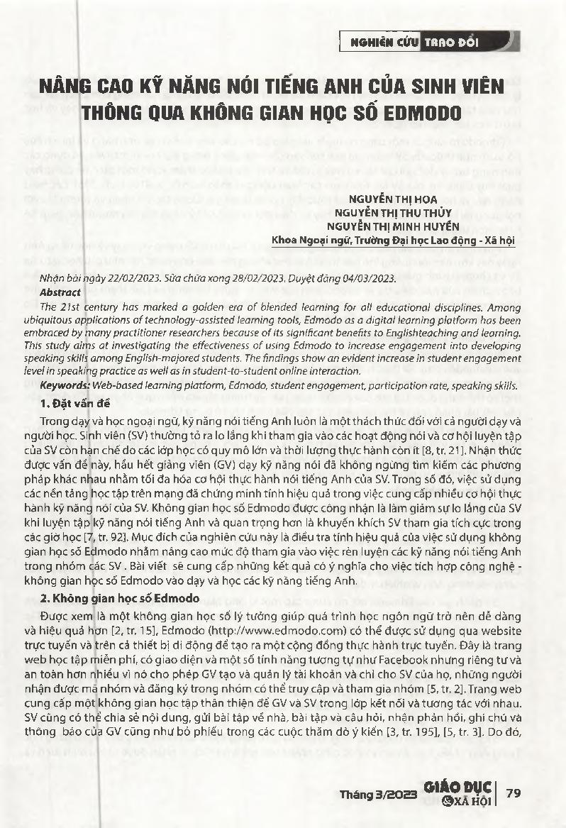 Nâng cao kỹ năng nói tiếng Anh của sinh viên thông qua không gian học số Edmodo = Developing English speaking skills among students by using web-based learning platforms Edmodo.