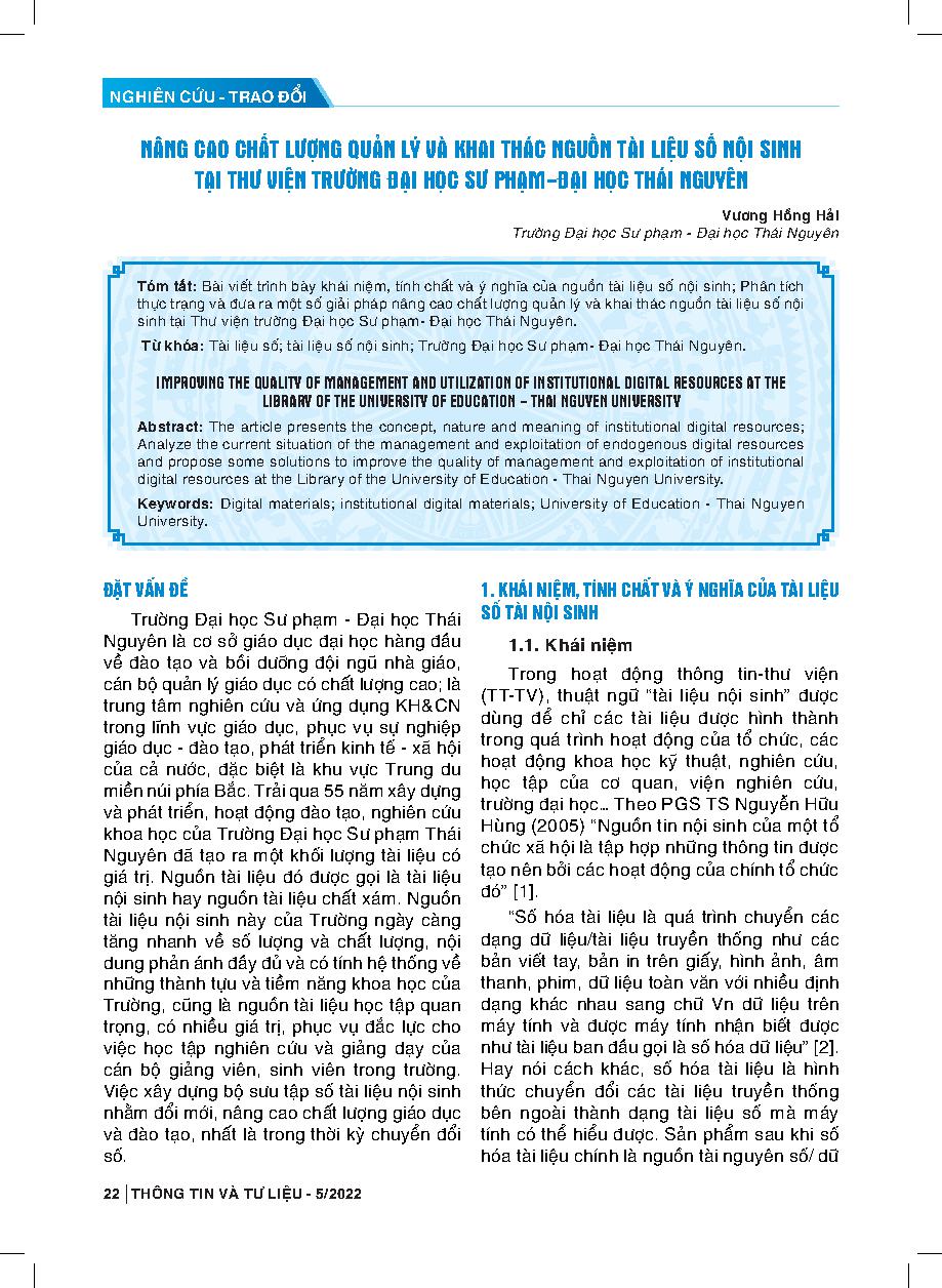 Nâng cao chất lượng quản lý và khai thác nguồn tài liệu số nội sinh tại thư viện trường Đại học Sư phạm-Đại học Thái Nguyên = Improving the quality of management and utilization of institutional digital resources at the library of the University of Educat