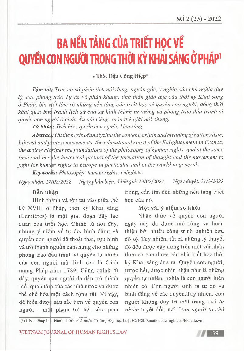 Ba nền tảng của triết học vê&; 39; quyển con người trong thời kỳ khai sáng ở Pháp = Three foundations of the philosophy of human rights in the Enlightenment in France