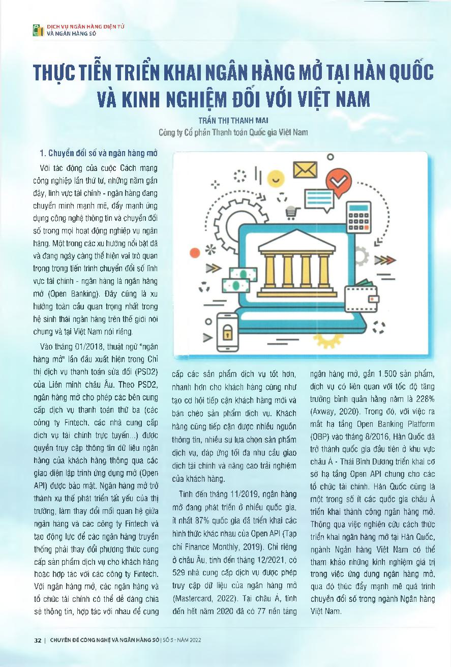 Thực tiễn triển khai Ngân hàng mở tại Hàn Quốc và kinh nghiệm đối với Việt Nam = Practices of implementing Open Banking in Korea and experiences with Vietnam