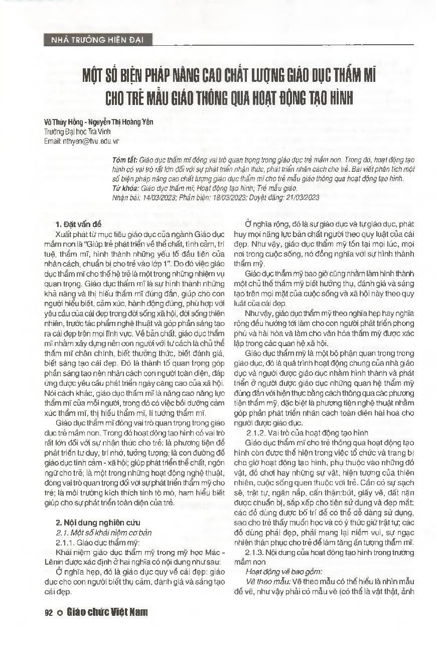 Một số biện pháp nâng cao chất lượng giáo dục thẩm mỹ cho trẻ mẫu giáo thông qua hoạt động tạo hình = Some measures to improve the quality of aesthetic education for the preschool children through shaping activities