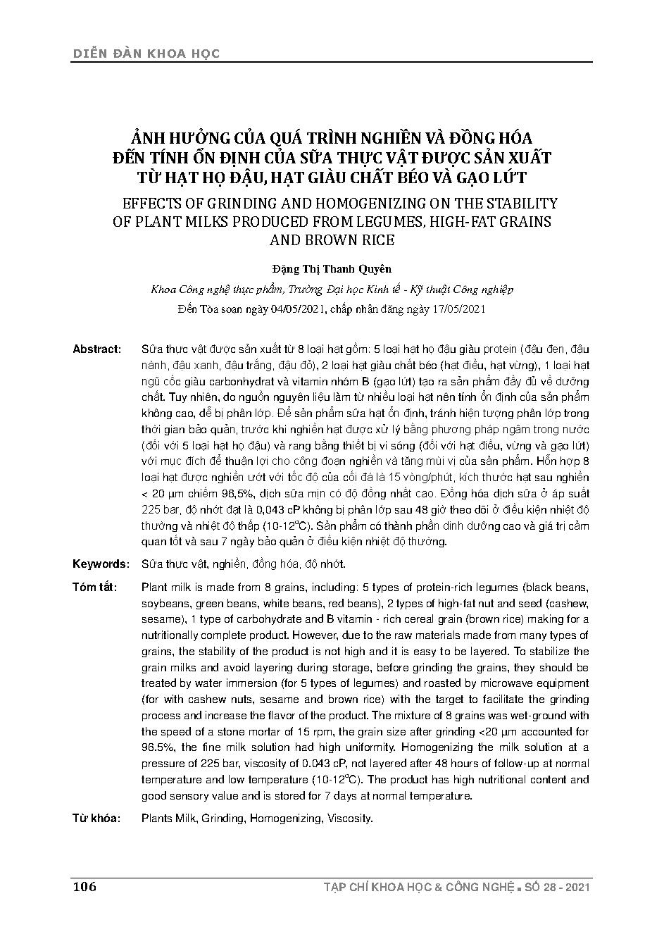 Ảnh hưởng của quá trình nghiền và đồng hóa đến tính ổn định của sữa thực vật được sản xuất từ hạt họ đậu, hạt giàu chất béo và gạo lứt