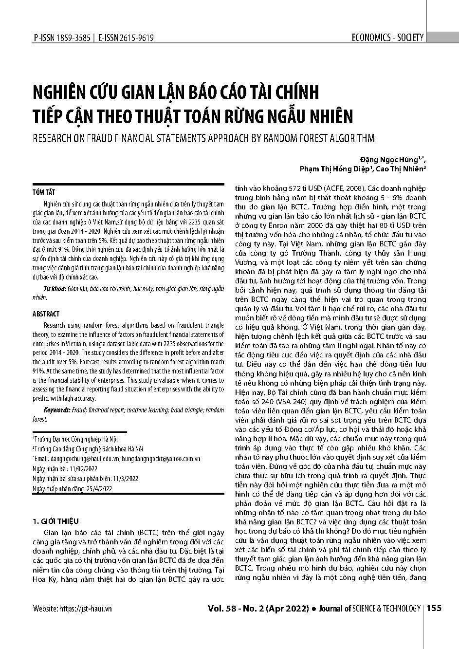 Nghiên cứu gian lận báo cáo tài chính tiếp cận theo thuật toán rừng ngẫu nhiên = Research on fraud financial statements approach by random forest algorithm
