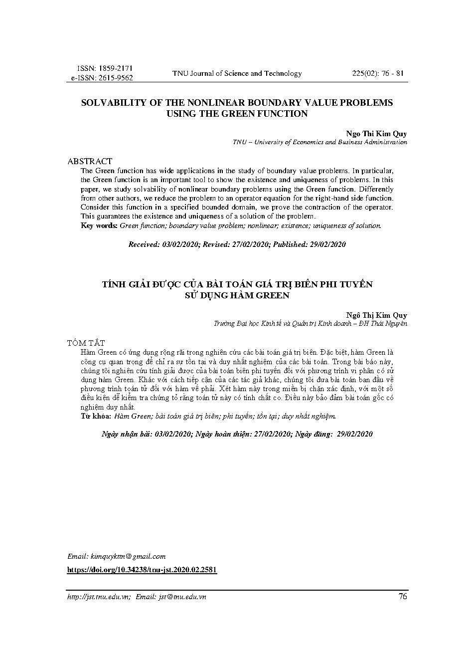 Tính giải được của bài toán giá trị biên phi tuyến sử dụng hàm Green = Solvability of the nonlinear boundary value problems using the green function