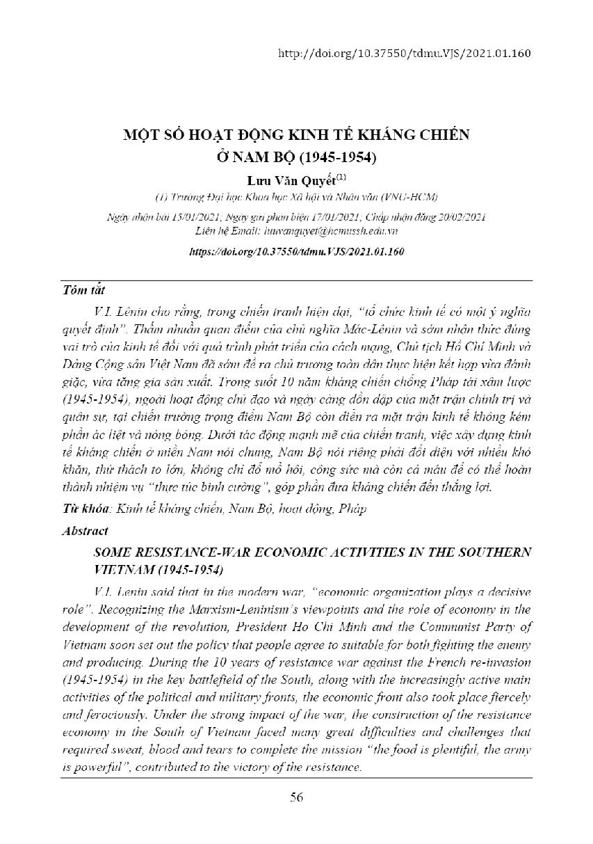 Một số hoạt động kinh tế kháng chiến ở Nam Bộ (1945-1954) = Some resistance-war economic activities in the southern Viietnam (1945-1954)