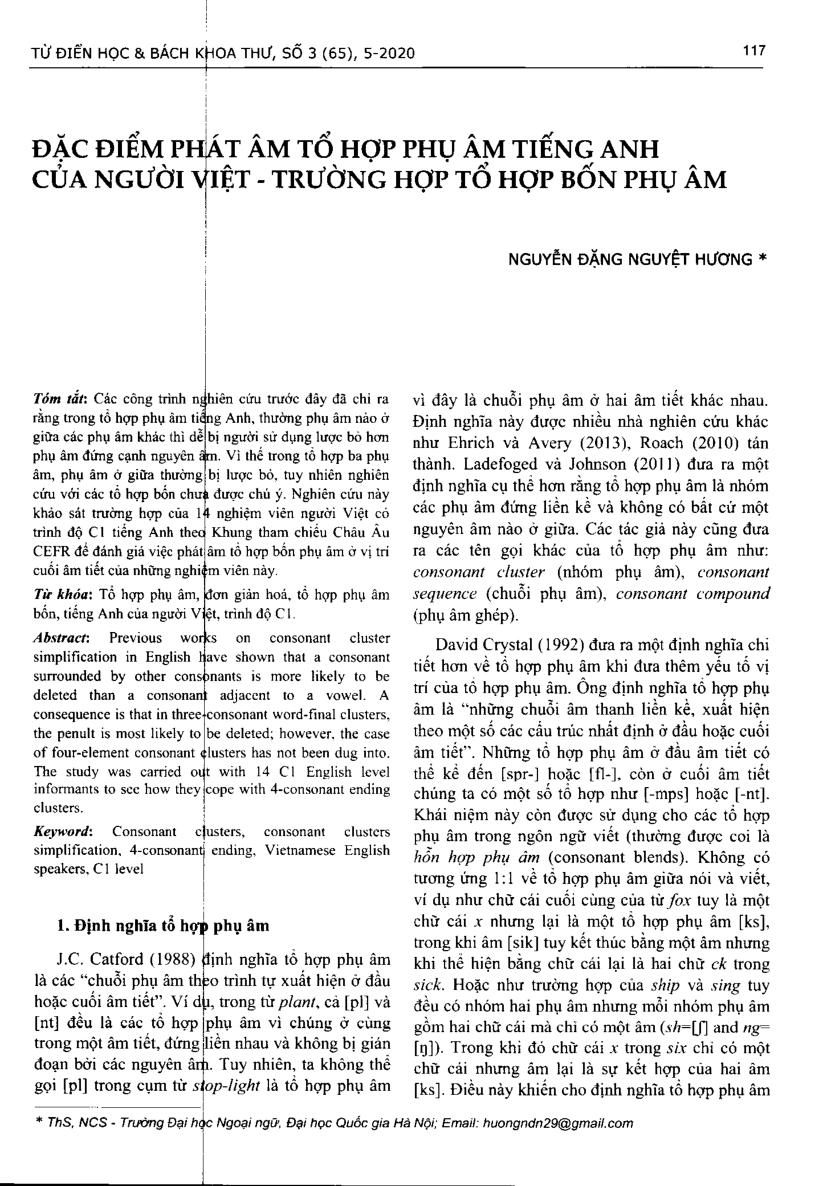 Đặc điểm phát âm tổ hợp phụ âm tiếng Anh của người Việt - trường hợp tổ hợp bốn phụ âm = Consonant chuster simplification - the case of Vietnamese Einglish speakers