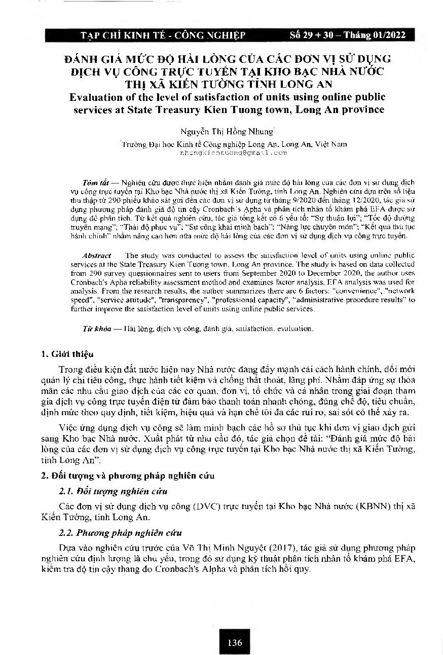 Đánh giá mức độ hài lòng của các đơn vị sử dụng dịch vụ công trực tuyến tại Kho bạc Nhà nước thị xã Kiến Tường tỉnh Long An = Evaluation of the level of satisfaction of units using online public services at State Treasury Kien Tuong town, Long An province