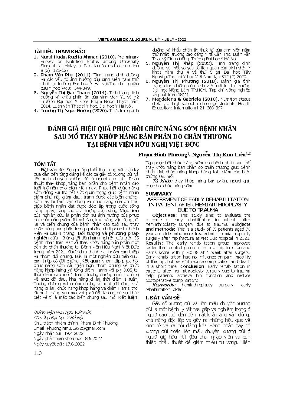 Đánh giá hiệu quả phục hồi chức năng sớm bệnh nhân sau mổ thay khớp háng bán phần do chấn thương tại Bệnh viện Hữu nghị Việt Đức = Assessment of early rehabilitation in patient after hemiarthroplasty due to trauma
