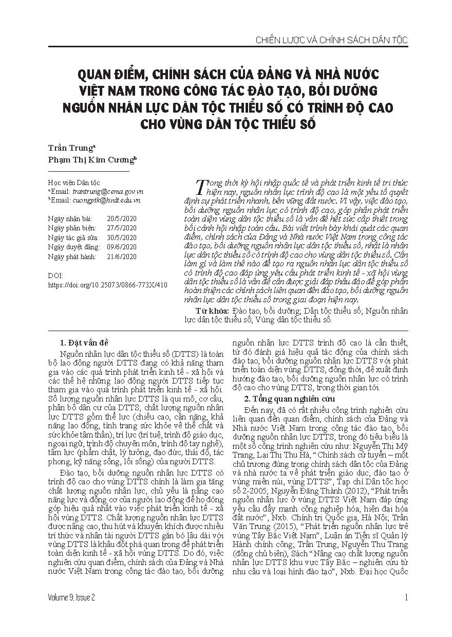 QUAN ĐIỂM, CHÍNH SÁCH CỦA ĐẢNG VÀ NHÀ NƯỚC VIỆT NAM TRONG CÔNG TÁC ĐÀO TẠO, BỒI DƯỠNG NGUỒN NHÂN LỰC DÂN TỘC THIỂU SỐ CÓ TRÌNH ĐỘ CAO CHO VÙNG DÂN TỘC THIỂU SỐ = OPINIONS, POLICIES OF THE PARTY AND THE STATE OF VIETNAM IN TRAINING, RETRAINING FOR ETHNIC MINORITY HIGHLY QUALIFIED HUMAN RESOURCES FOR ETHNIC MINORITY AREAS