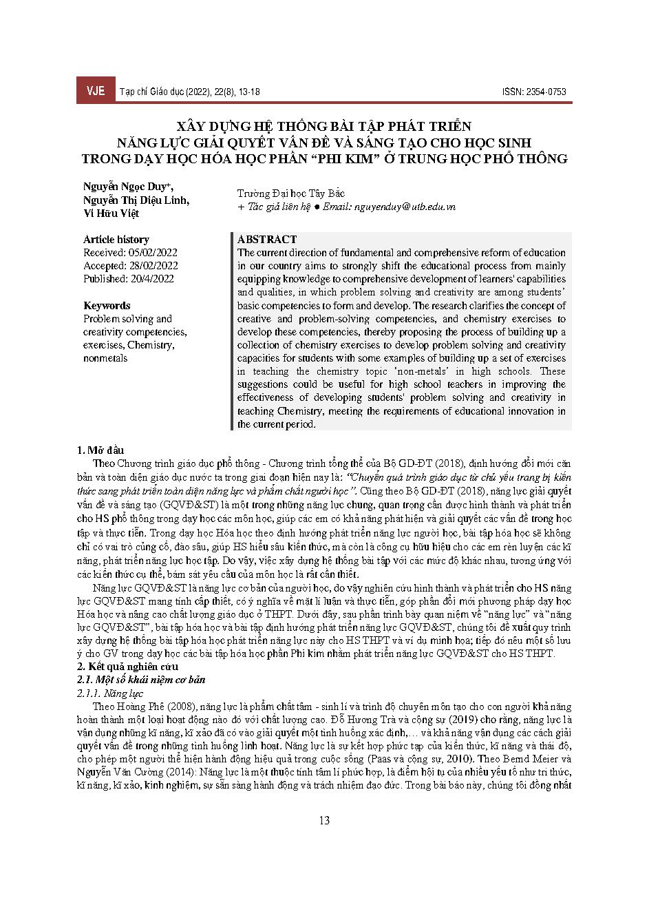Xây dựng hệ thống bài tập phát triển năng lực giải quyết vấn đề và sáng tạo cho học sinh trong dạy học hóa học phần “phi kim” ở trung học phổ thông = Building a system of exercises to develop problem solving and creativity for students in teaching chemist