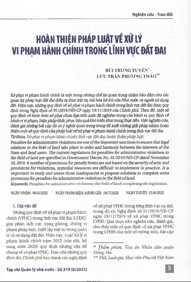 Hoàn thiện pháp luật về xử lý vi phạm hành chính trong lĩnh vực đất đai = Completing the legislation on handling administrative violations in the field of land