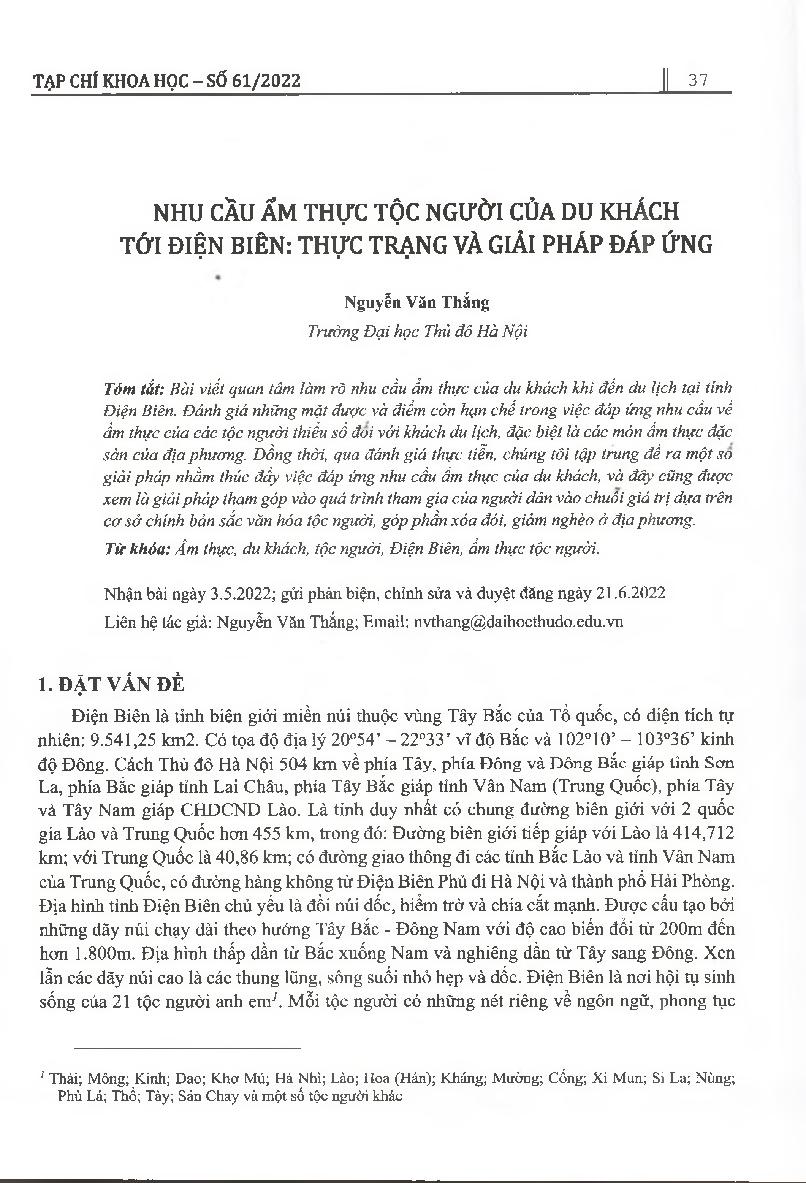 Nhu cầu ẩm thực tộc người của du khách tới Điện Biên: Thực trạng và giải pháp đáp ứng = He demand of tourists regarding ethnic cuisine in Dien Bien province: Situation and solutions