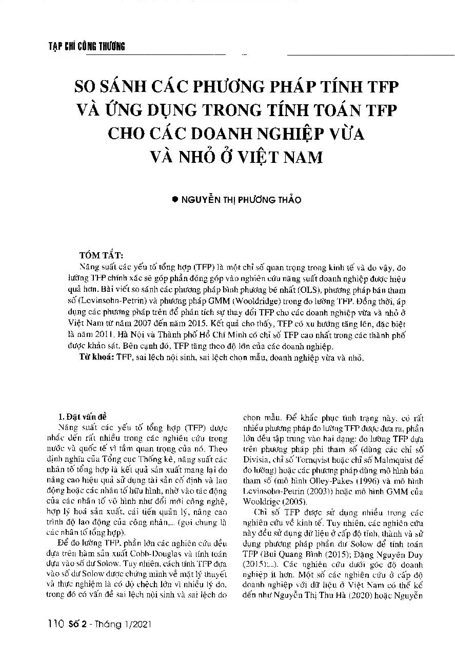 So sánh các phương pháp tính TFP ứng dụng trong tính toán TFP cho các doanh nghiệp vừa và nhỏ ở Việt Nam = Comparing different measurement of the Total Factor Productivity indicator: Applying in the case of Vietnamese small and medium-sized enterprises