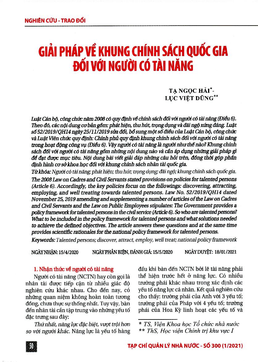 Giải pháp về khung chính sách quốc gia đối với người có tài năng = Solution on the national policy framework for talented people
