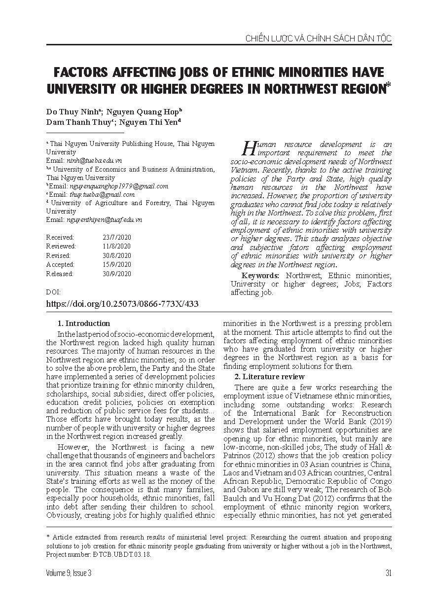 FACTORS AFFECTING JOBS OF ETHNIC MINORITIES HAVE UNIVERSITY OR HIGHER DEGREES IN NORTHWEST REGION* = CÁC YẾU TỐ TÁC ĐỘNG ĐẾN VIỆC LÀM CỦA NGƯỜI DÂN TỘC THIỂU SỐ CÓ TRÌNH ĐỘ ĐẠI HỌC TRỞ LÊN TẠI VÙNG TÂY BẮC