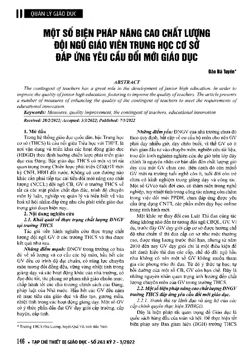 Một số biện pháp nâng cao chất lượng đội ngũ giáo viên trung học cơ sở đáp ứng yêu cầu đổi mới giáo dục = Some measures 146 of enhancing the quality of junior high school teachers to meet the requirements of educational innovation