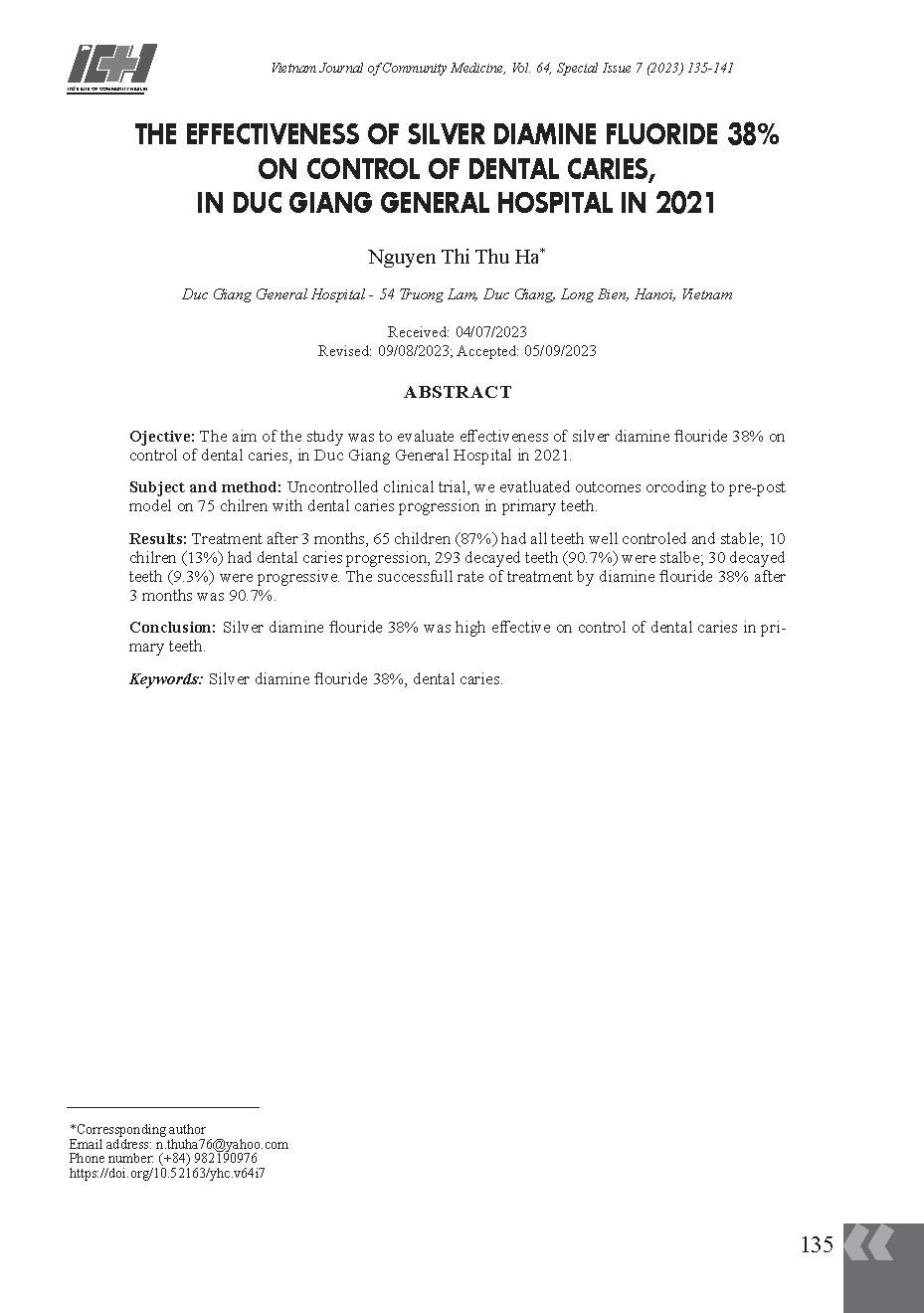 Hiệu quả kiểm soát sâu răng sữa của silver diamine fluoride 38% tại Bệnh viện Đa khoa Đức Giang năm 2021 = The effectiveness of silver diamine fluoride 38% on control of dental caries, in Duc Giang General Hospital in 2021