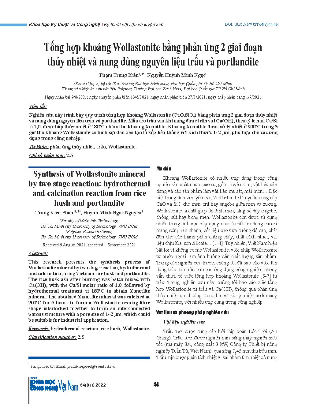 Tổng hợp khoáng Wollastonite bằng phản ứng 2 giai đoạn thủy nhiệt và nung dùng nguyên liệu trấu và portlandite = Synthesis of wollastonite mineral by two stage reaction: hydrothermal and calcination reaction from rice hush and portlandite