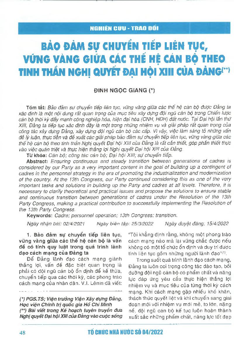 Bảo đảm sự chuyển tiếp liên tục, vững vàng giữa các thế hệ cán bộ theo tinh thần nghị quyết đại hội XIII của Đảng = Ensuring continuous and steady transition between generations of cadres under the Resolution of the 13th Party Congress