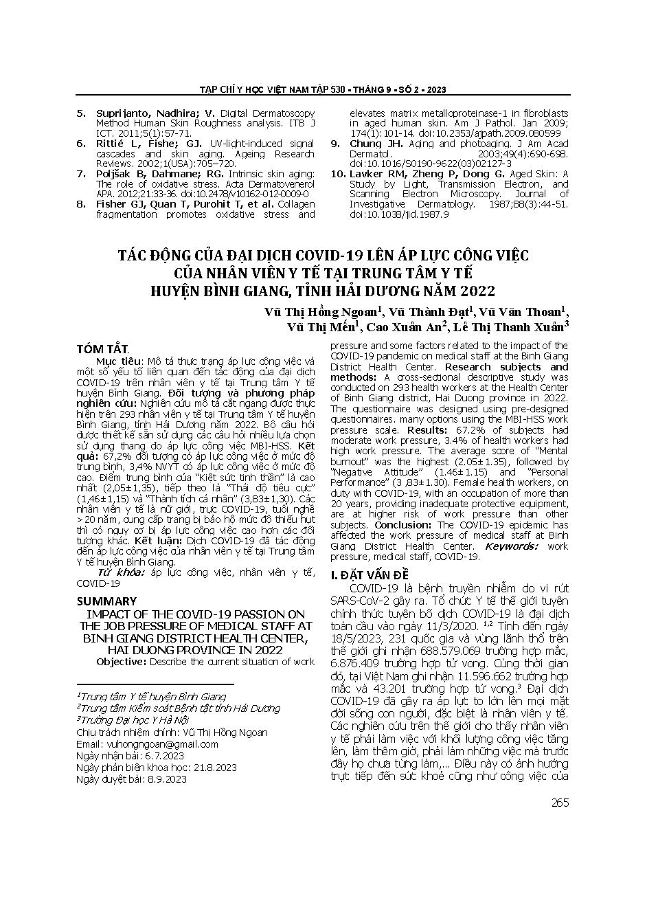 Tác động của đại dịch covid-19 lên áp lực công việc của nhân viên y tế tại trung tâm y tế huyện bình giang, tỉnh Hải Dương năm 2022 = Impact of the covid-19 passion on the job pressure of medical staff at binh giang district health center, hai duong provi