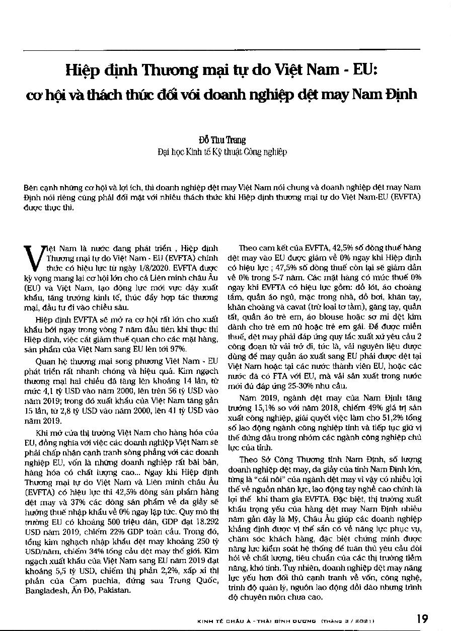 Hiệp định Thương mại tự do Việt Nam - EU: cơ hội và thách thức đối với doanh nghiệp dệt may Nam Định