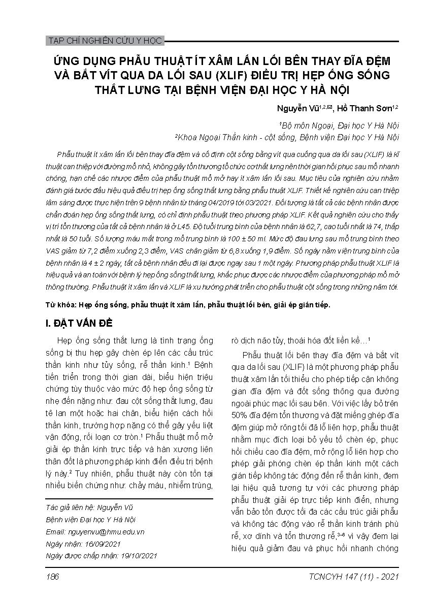 Ứng dụng phẫu thuật ít xâm lấn lối bên thay đĩa đệm và bắt vít qua da lối sau (XLIF) điều trị hẹp ống sống thắt lưng tại Bệnh viện Đại học Y Hà Nội = Extreme lateral interbody fusion and percutaneous pedicle screw (XLIF) for lumbar spinal stenosis at Hanoi medical university hospital