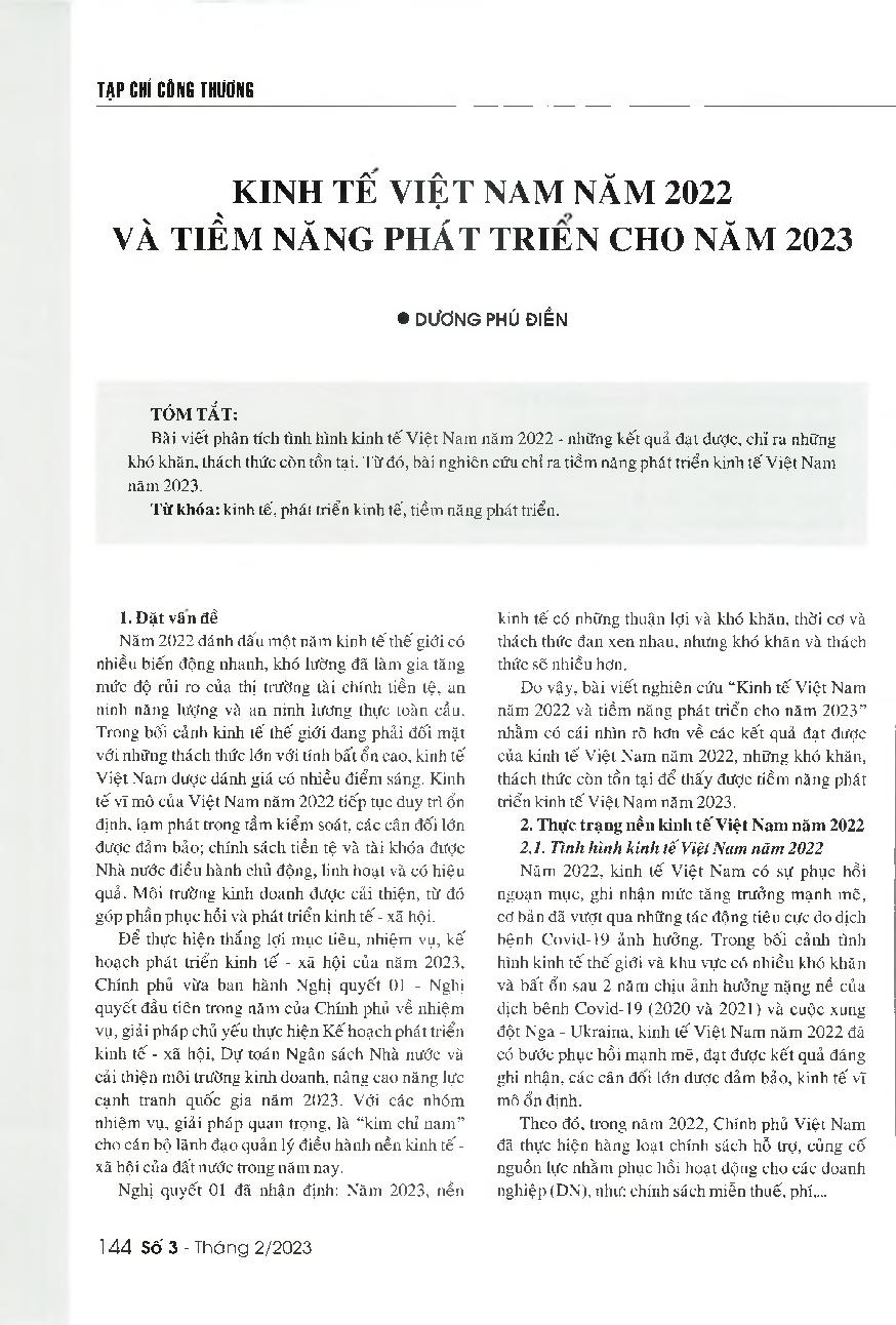 Kinh tế Việt Nam năm 2022 và tiềm năng phát triển cho năm 2023 = Vietnam's economy in 2022 and prospects in 2023