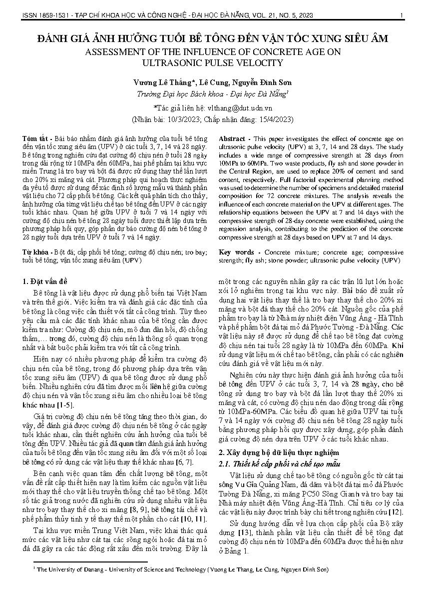 Đánh giá ảnh hưởng tuổi bê tông đến vận tốc xung siêu âm = Assessment of the influence of concrete age on ultrasonic pulse velocity