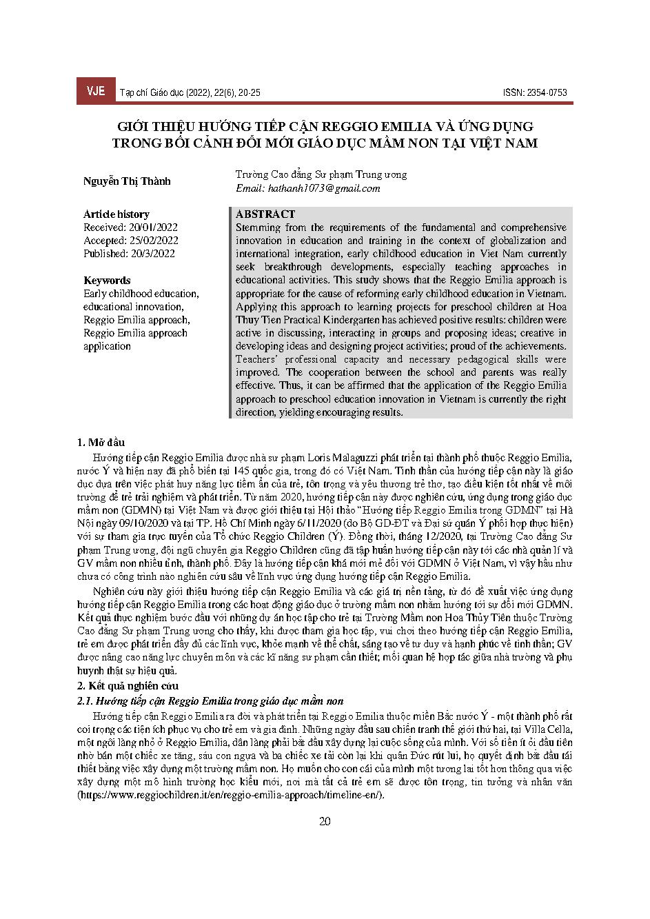 Giới thiệu hướng tiếp cận reggio emilia và ứng dụng trong bối cảnh đổi mới giáo dục mầm non tại Việt Nam = Introducing the reggio emilia approach and its application in the context of early childhood education innovation in Vietnam