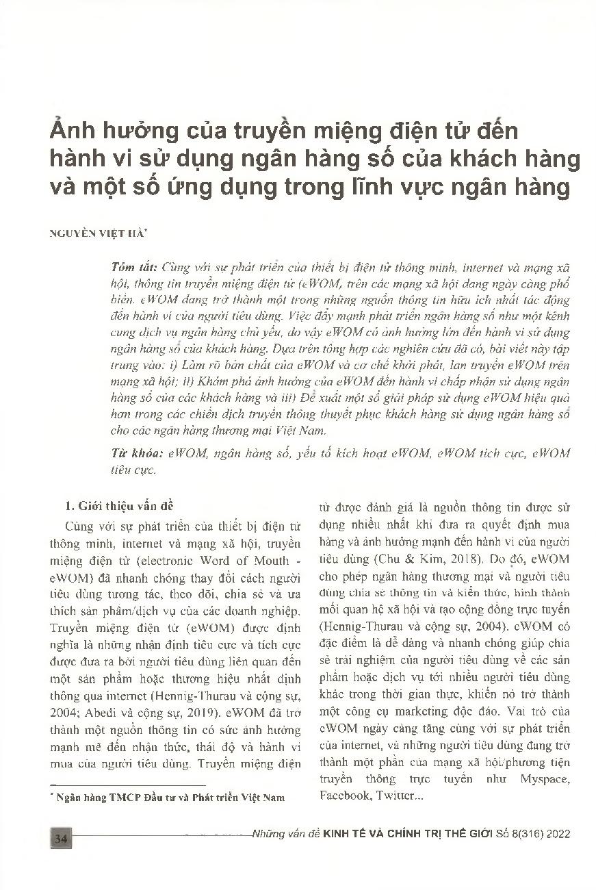 Ảnh hưởng của truyên miệng điện tử đên hành vi sử dụng ngân hàng số của khách hàng và một số ứng dụng trong lĩnh vực ngân hàng = Influence of electronic word of mouth on customers&; 39; behavior of using digital banking and some applications in the banking