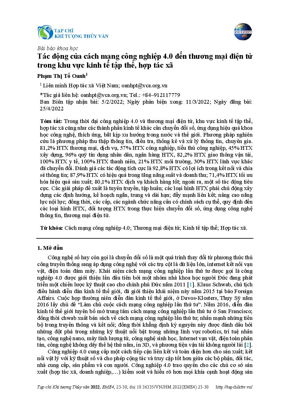 Tác động của cách mạng công nghiệp 4.0 đến thương mại điện tử trong khu vực kinh tế tập thể, hợp tác xã = Impaction of 4.0 industrial revolution on ecommerce of cooperation economy, cooperatives