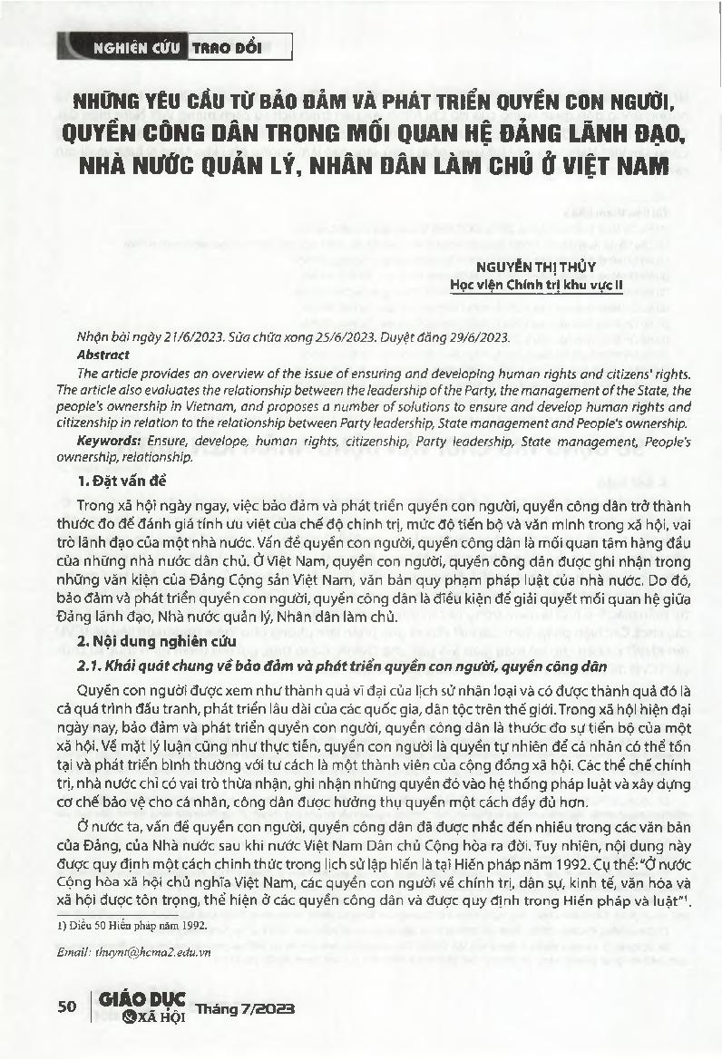 Những yêu cẩu từ bảo đảm và phát triển quyến con người, quyến công dân trong mối quan hệ Đảng lãnh đạo, Nhà nước quản lý, nhân dân làm chù ở Việt Nam = Requirements from ensuring, developing human rights and citizenship in the relationship between the Par