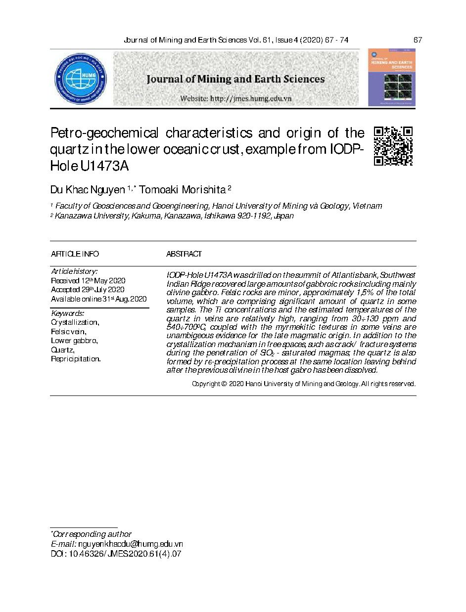 Luận bàn về đặc điểm, nguồn gốc và cơ chế thành tạo khoáng vật thạch anh của đai mạch felsic trong lớp vỏ dưới gabro thuộc kiểu vỏ đại dương thực thụ, ví dụ từ lỗ khoan U1473A = Petro-geochemical characteristics and origin of the quartz in the lower oceanic crust, example from IODPHole U1473A
