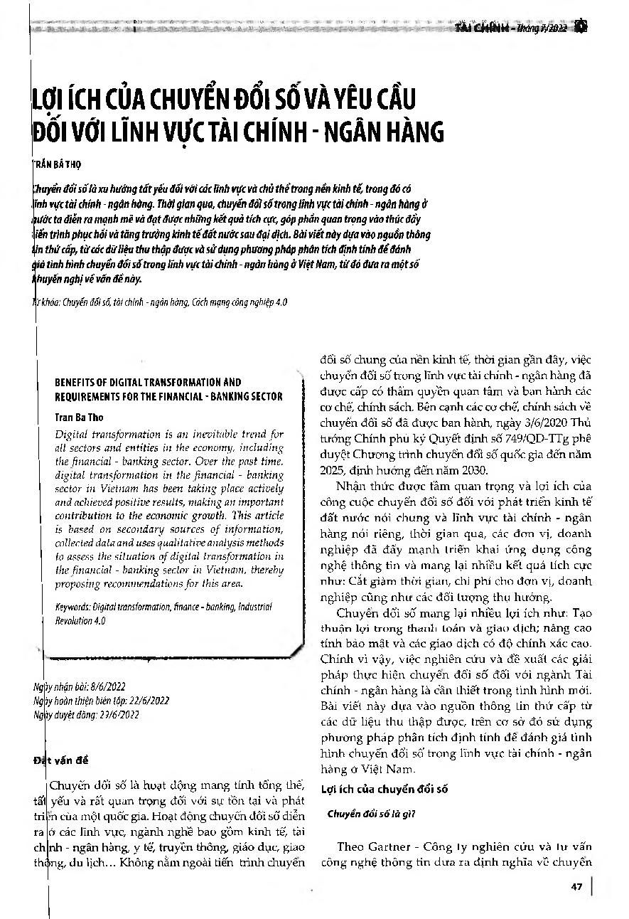Lợi ích của chuyển đổi số và yêu cầu đối với lĩnh vực tài chính - ngân hàng = Benefits of digital transformation and requirements for the financial - banking sector