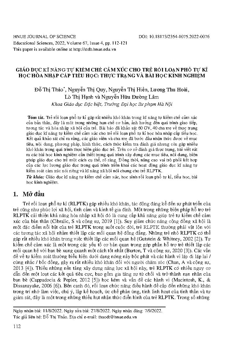 Giáo dục kĩ năng tự kiềm chế cảm xúc cho trẻ rối loạn phổ tự kỉ học hòa nhập cấp tiểu học: thực trạng và bài học kinh nghiệm = Education of emotional self-control skills for children with autism spectrum disorders in inclusive school: conditions and lesso